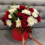Белые хризантемы и красные розы в шляпной коробке в Мысках