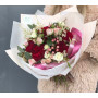 Яркий сочный букет из бордовых роз со светлыми вкраплениями кустовых розочек и гиперикума станет идеальным подарком той, которая сочными красками озаряет Вашу жизнь и дарит Вам улыбку и тепло. Страсть и буйство роз оттеняют нежные цветы хамелацикма и вероники, а также мятного цвета свежий эвкалипт. Оригинальная упаковка из воздушного фетра, картона и компны розовых лент превращают букет в пышный яркий подарок.
